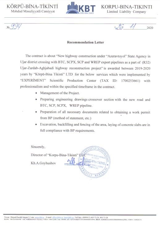 "İstilikenerjitikintiquraşdırma" ASC Tövsiyə Məktubu